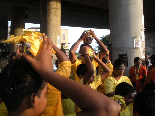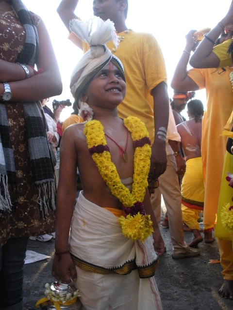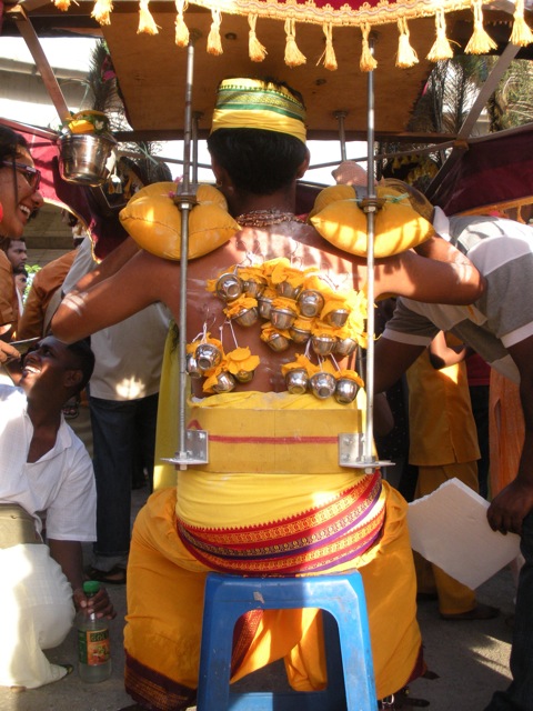 The festival honors Lord Murugan and commemorates the occasion when Parvati gave Murugan a “vel” (meaning spear, pronounced veil) to vanquish a demon. This is essentially a time for his followers to say thank you for their prayers being answered in the previous year, for things like recovery from illness or a new baby. Although the focus is on individual sacrifice, it is very much a community event, including lots of children.