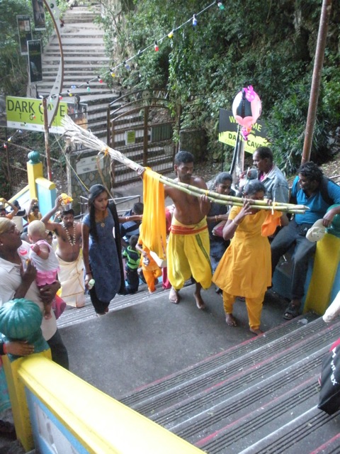 Once prepared, people proceeded across the street from the river, and along the walkway to the foot of the stairs up to the caves themselves. Some walked, some staggered, some danced, and believe it or not, some rolled. They all were completely absorbed in the task at hand and made their way at their own pace up the steep steps to queue in the cave and await their turn to present their kavadi to Murugan. The greater their pain, the greater their glory.