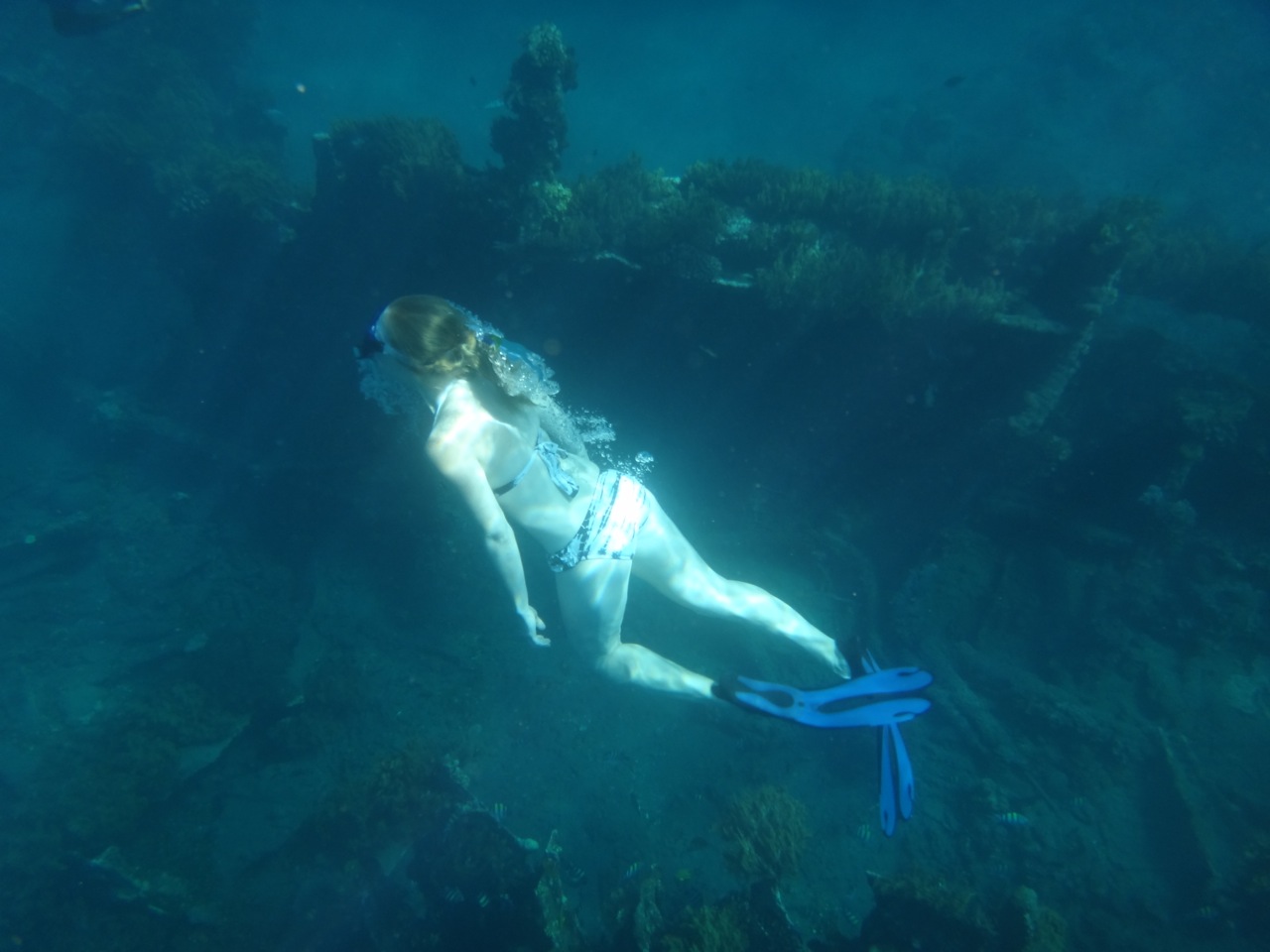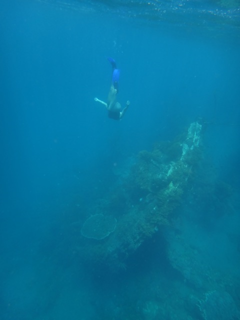 We snorkeled right off the beach, with equipment rented from the beach boys, but one day we took a trip by outrigger boat out to a “Japanese” wreck for a change of pace. The water was a bit polluted with floating trash, but it was neat to see the wreck (which probably isn’t actually a Japanese boat), and you could dive down towards it for a closer view. We saw tons of fish, including barracuda, and some really neat coral here.