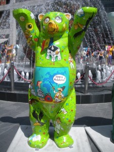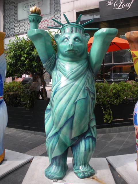 There are about 140 bears, one for each country recognized by the United Nations. Each is two meters tall (yes, I’m working on getting used to the metric system again), and they stand in a circle with their arms upraised, “hand in hand” to promote tolerance and living in peace and harmony. These begin with identical fiberglass casts, and each country has chosen artists to decorate the bear in a manner to represent that country. The US went with a pretty iconic choice: